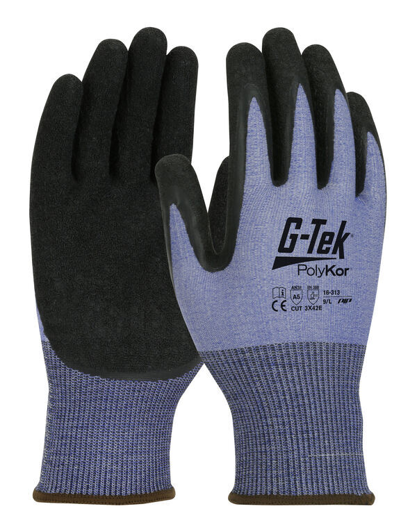Gants tricotés sans couture en PolyKor® X7™. Jauge 18. Enduction paume et bout des doigts en latex crêpé. Poignet tricot élastiqué. | Coupure niveau E.
