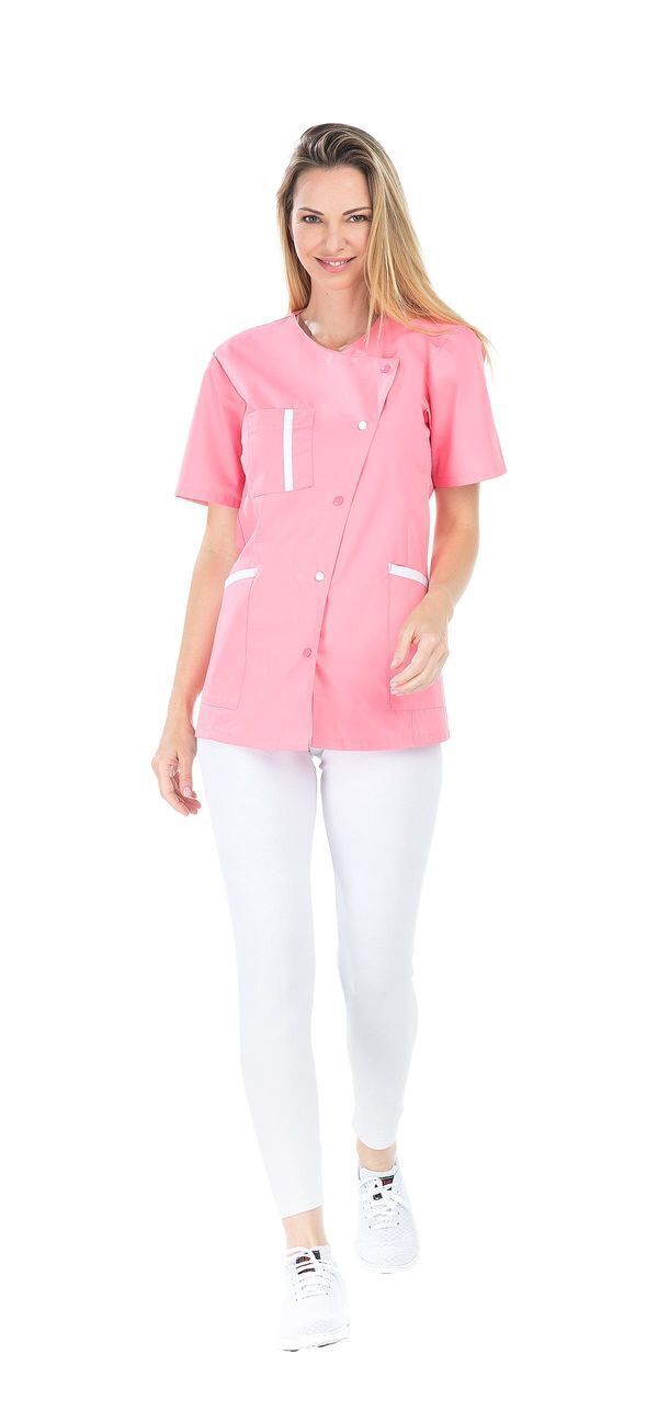 Tunique femme. Encolure V. Fermeture asymétrique par boutons-pression contrastées. Poche poitrine avec compartiment stylo, 2 poches basses. Manches courtes. Longueur : 75 cm.