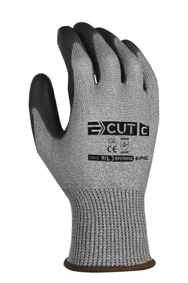 Gants support tricoté HPPE. Jauge 13. Enduction en PU noir. Poignet tricot élastiqué. | Coupure niveau C.