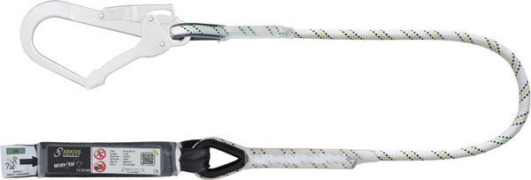 Longe absorbeur longueur 1,5 m. 1 mousqueton d’échafaudage à verrouillage automatique ouverture 50 mm. 1 absorbeur d’énergie en sangle. Largeur : 35 mm. 1 longe en corde polyamide tressée diamètre 12 mm. Boucles cossées. Coutures protégées sous gaine transparente. | Testé 100kg.